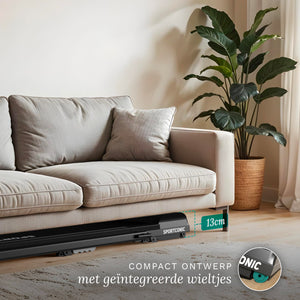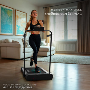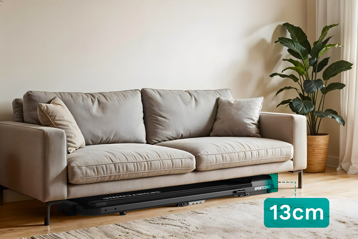 Løbebåndet er ideelt til hjemmebrug takket være dets smarte og kompakte design. Med en sammenfoldet højde på kun 13 centimeter glider det ubesværet ind under en sofa, seng eller et skab. De integrerede hjul gør det hurtigt og nemt at flytte det, selv i mindre opholdsrum.