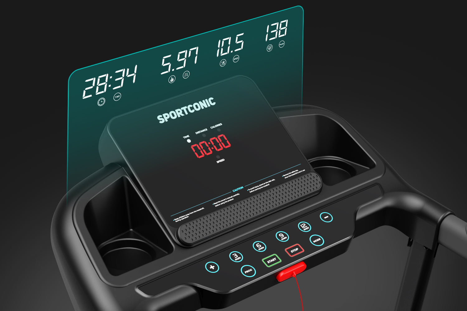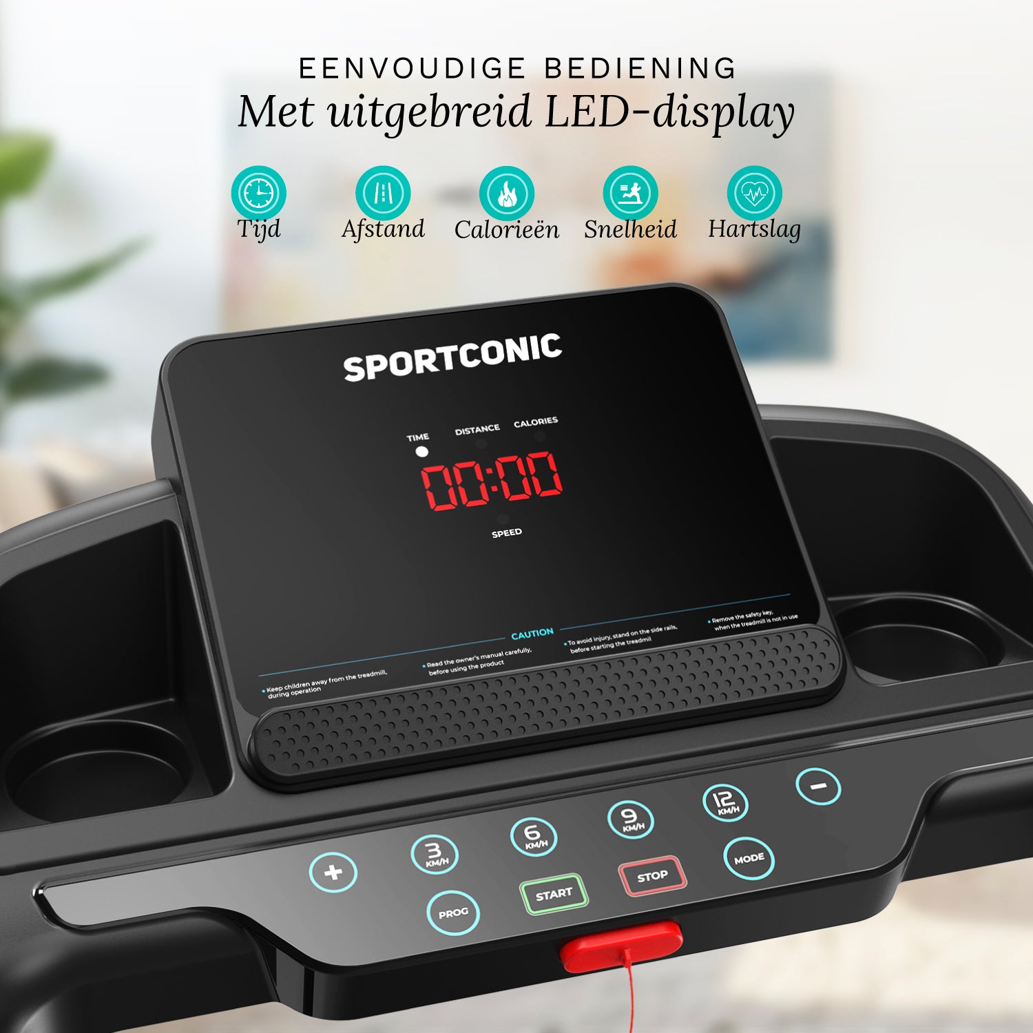 Løbebåndet har et klart LED-display, der viser dig distance, tid, hastighed, puls og forbrændte kalorier i realtid.